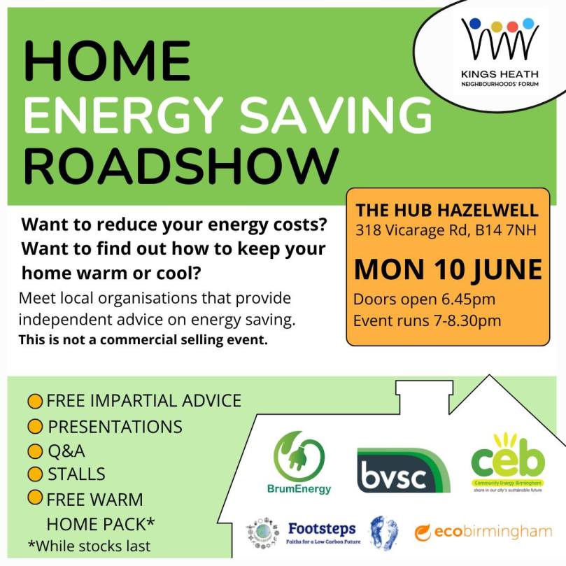 On 10 June the Kings Heath Neighbourhoods Forum organised a Home Energy Saving Roadshow at the Hub Hazelwell. The overarching aim was to point residents towards non-commercial local organisations that can assist with the transition towards cleaner and cheaper home energy systems that also promise an increase in comfort.