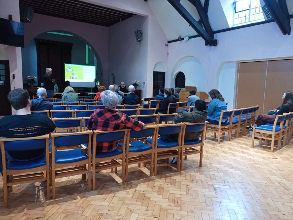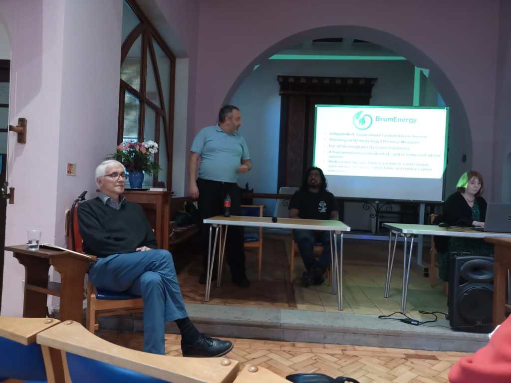 The presentations started with Tom Holness giving an overview of BrumEnergy, an umbrella organisation funded by various Government grants delivering free, independent, and high-quality home energy advice to Birmingham residents. 12 local organisations are contributing to this mission (of which three were represented at the event). Their website contains a wealth of advice and pointers to additional resources, but the main takeaway, perhaps, is their offer to provide a free personalised advice session.